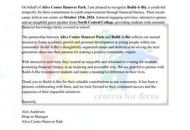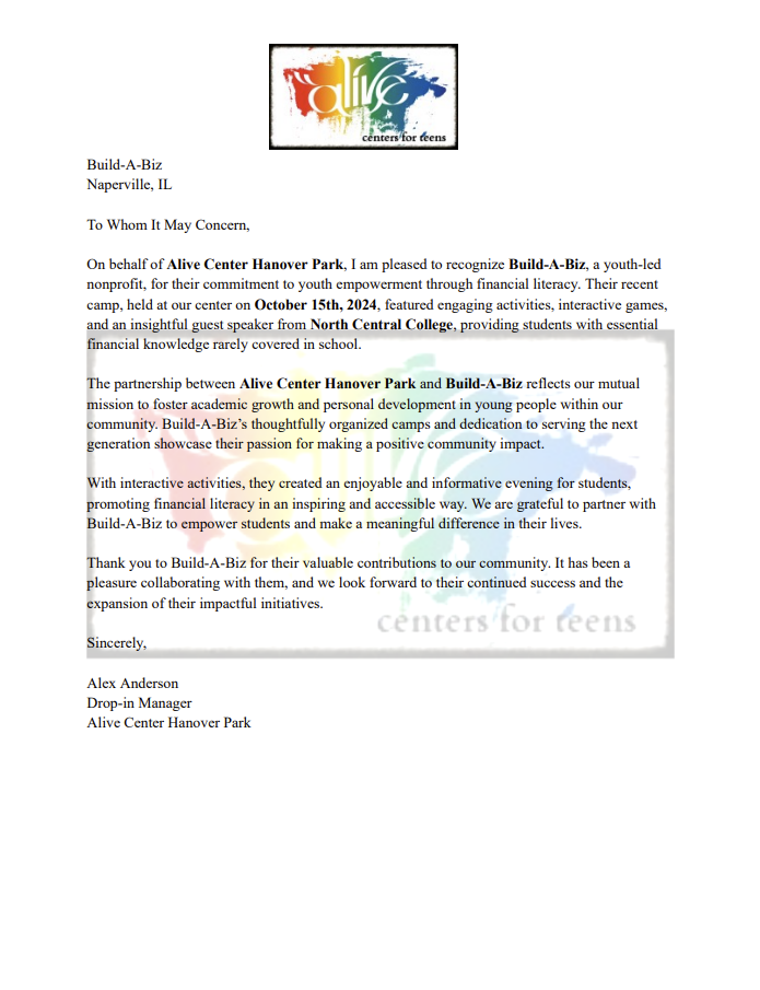 We would like to thank all our sponsors/supporters for help making the Alive Center Hanover Park event possible! We had 60+ kids show up and were able to provide students valuable, hands on experience with budgeting, investing, saving and more through interactive events, games and speakers! Thank you to Alex at Alive Center Naperville and Dr. Decker and Mr. Jared Moser of North Central college for supporting us on this journey!